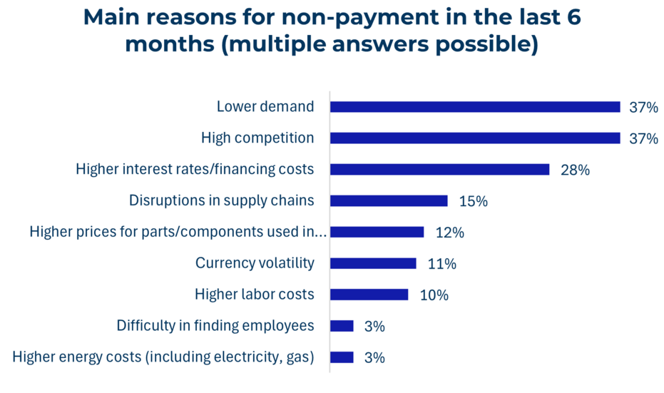 • Late payments: 77% of companies report late payments (51% in 2024)